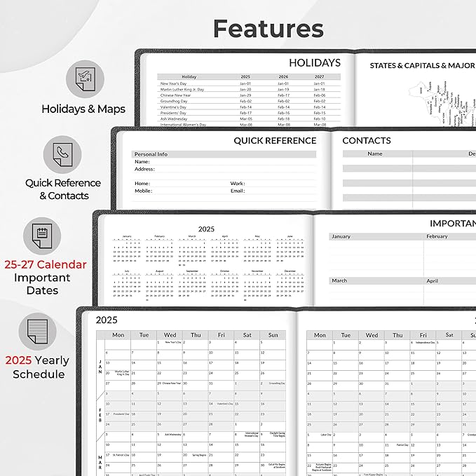 - Additional Features - The weekly planner includes 2025-2027 calendars, holiday lists, contact pages, notes pages, important dates, and US time zone map.