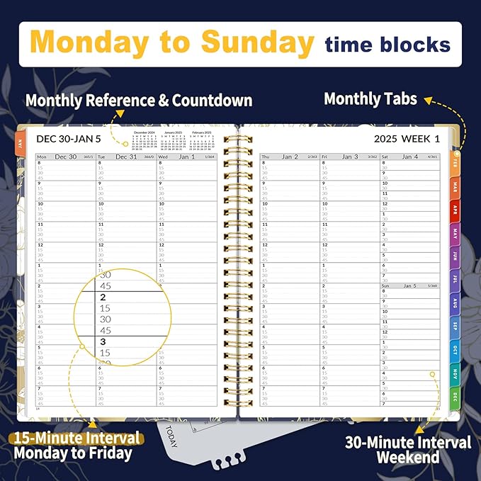 - Weekly View - 2-page weekly layout from Monday to Sunday, 15-minute time slots in increments from 7:00 a.m. to 8:45 p.m. on weekdays, and 7:00 a.m. to 8:30 p.m. on weekends, 3-month reference previews, allowing you to manage time and track appointments easily.
