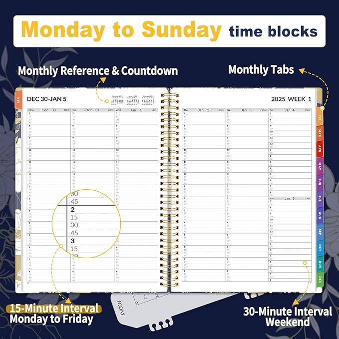 - Weekly View - 2-page weekly layout from Monday to Sunday, 15-minute time slots in increments from 7:00 a.m. to 8:45 p.m. on weekdays, and 7:00 a.m. to 8:30 p.m. on weekends, 3-month reference previews, allowing you to manage time and track appointments easily.