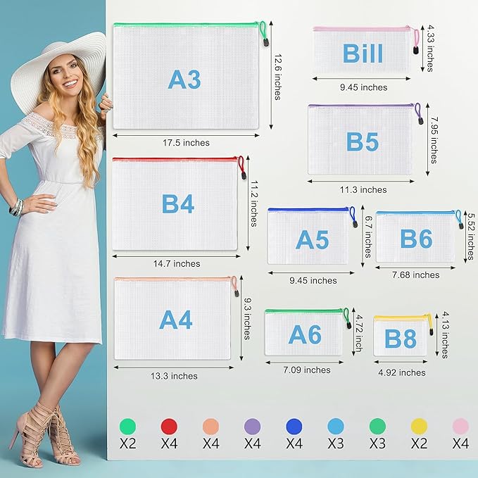 - 【Mesh Zipper Pouch】- These Mesh Zipper Pouches include 30 waterproof zipper bag in 9 different sizes and colors, providing plenty of options for organizing. The set consists of 2*A3 (Light Green), 4*B4 (Red), 4*A4 (Light Orange), 4*B5 (Purple), 4*A5 (Blue), 3*B6 (Light Blue), 3*A6 (Green), 4*Bills (Pink), and 2*B8 (Yellow) and 30 small blank labels