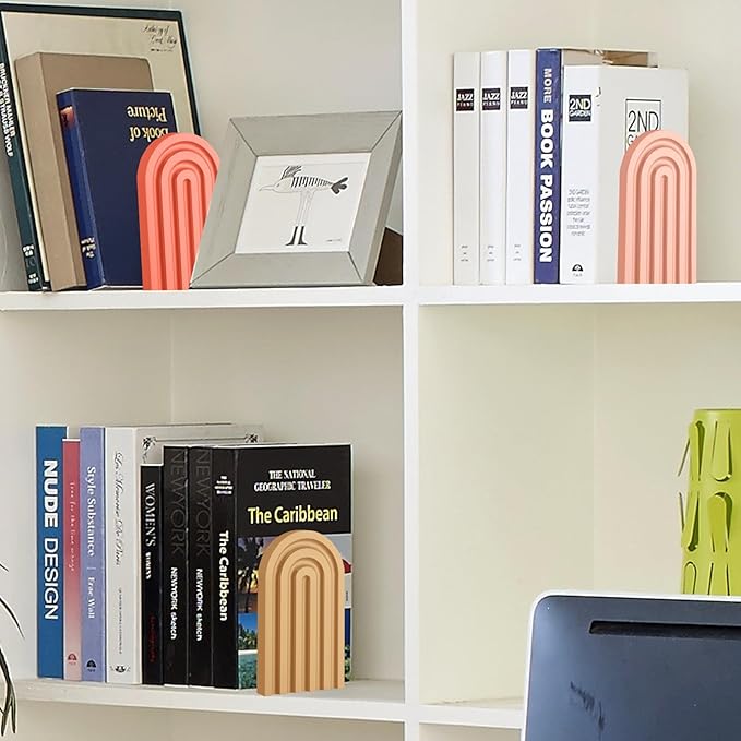 - Boho and Simple Design: our non skid book ends for room are designed with rainbow shape and 4 kinds of beautiful color system, and each one has fine carvings, which can add elegant, concise and natural style to your shelf