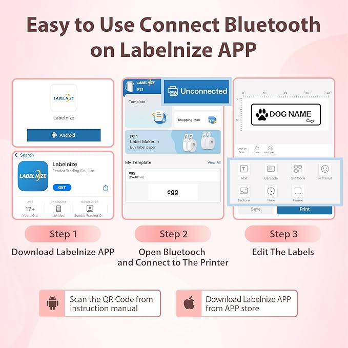 - 【Easy to Use】The bluetooth label maker is compatible with IOS and Android phones via wireless Bluetooth connection. Step 1: Download the "Labelnize" APP from Google Play or App Store.Step 2: Install the paper roll. Step 3: Connect P21 Bluetooth in APP. Step 4: Select Quick Template and start printing. (Note: Not applicable to computers)