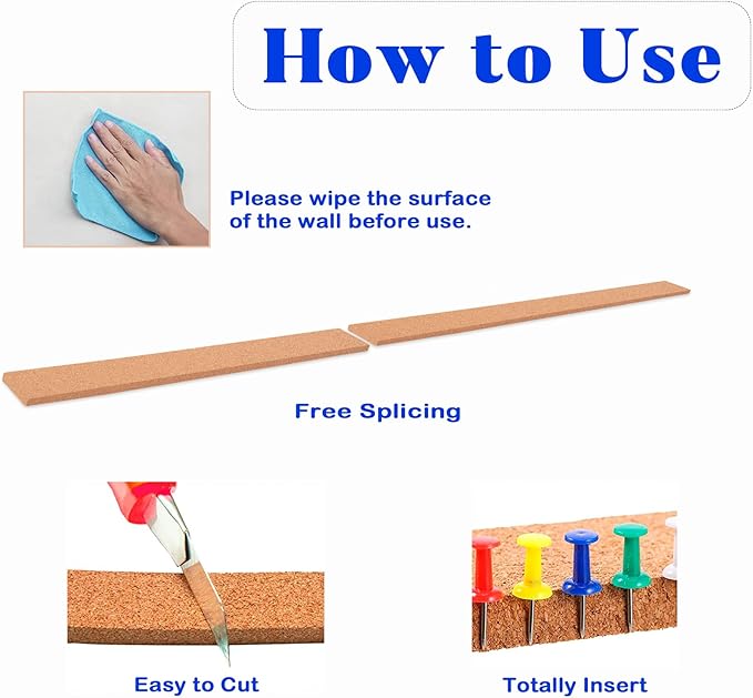 - 【EASY TO CUT & HANG】 With its flexible and easy-to-cut design, our corkboard bulletin bar strip can be easily customized to fit any size or shape you need, or connect more strips to make an extra-long one. It's also effortless to install, making it perfect for DIY projects and home decor.
