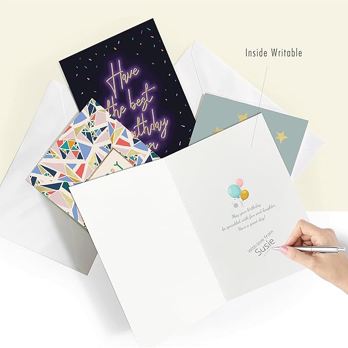 - BIRTHDAY CARDS WITH MESSAGE INSIDE: Each happy birthday card contains a different, short, birthday greeting on the inside that is perfect for businesses or individuals that prefer more generic birthday greetings. Need additional personalization? Our 4 x5.5 inch birthday cards assortment with greetings inside provide plenty of space to include a heartfelt message of your own!