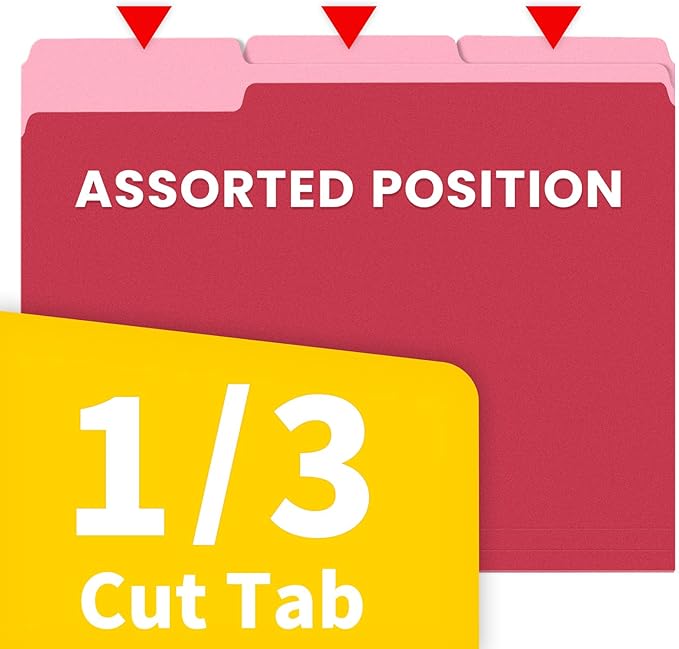 - 1/3 Cut Tab: Navigate through your files seamlessly with the 1/3 cut tab feature. This thoughtful design allows easy labeling, making it simple to categorize and retrieve documents efficiently. Stay organized and in control with these user-friendly folders.