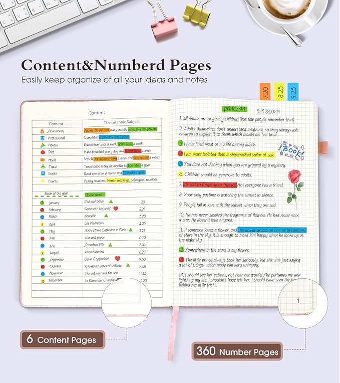 - 【Humanized Design】 ❶ 360 numbered pages, 6 contents pages, you can easily keep organize of all your ideas and notes.❷2 Divider sticky notes, 2 Bookmarks to help you find important content faster..❸ Back Inner pocket can holds notes, business cards, small gadgets, etc. ❹ Closes with an elastic band, Pen holder loop for any pen.