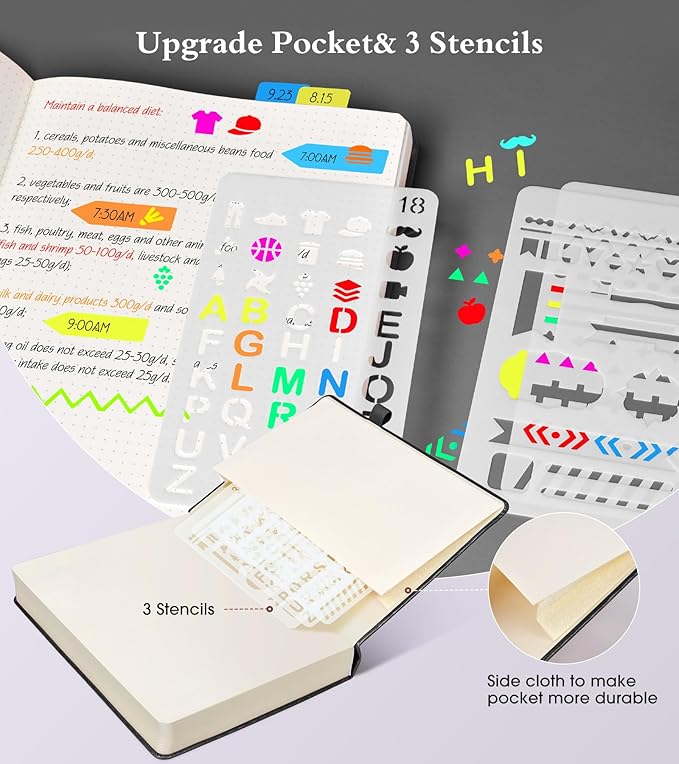 - 【Humanized Design】 ❶ 360 numbered pages, 6 contents pages, you can easily keep organize of all your ideas and notes.❷2 3 stencils for journaling (5.4''*8.07'') help you to make page layout and artistic creation better and faster. 2 Bookmarks to help you find important content faster..❸ Back Inner pocket can holds notes, business cards, small gadgets, etc. ❹ Closes with an elastic band, Pen holder loop for any pen.