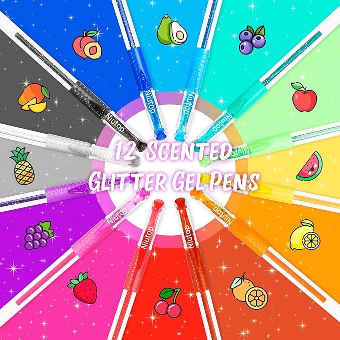 - 12 Vibrant Colors Scented Glitter Gel Pens for Kids and Adults. Assorted of 12 fruity scents. Perfect for adding a little sparkle to your craft projects, color-coded notes, journaling, drawing, coloring and teaching incentives.
