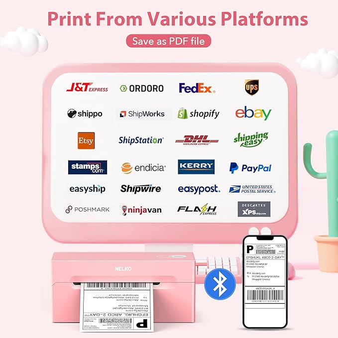 - Strong Platform Compatibility: This bluetooth shipping label printer can work with virtually all platforms, including Amazon, Ebay, Shopify, USPS, UPS, Esty, PayPal, Poshmark,etc.(Note: Please remember to save the logistics label as a PDF on the logistics platform, then upload it to the editor APP "NELKO" or "Shipping Printer Pro" for printing
