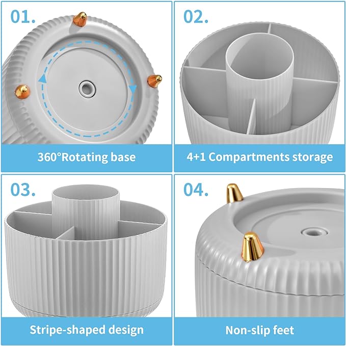 - 【Multipurpose Desktop Organizer】: This rotating storage organizer is perfect for pencils, cosmetics, bathroom necessities, toiletries, and even kitchen utensils. Try it in your craft room, playroom, laundry/utility room, and even inside bathroom cabinets or under the sink; Store extra office supplies like painting pens, correction tape, scissors, TV Remote, and more; Even headphones or a charger will no longer be lying around in the future! Maximize your vertical space and keep your desk clear