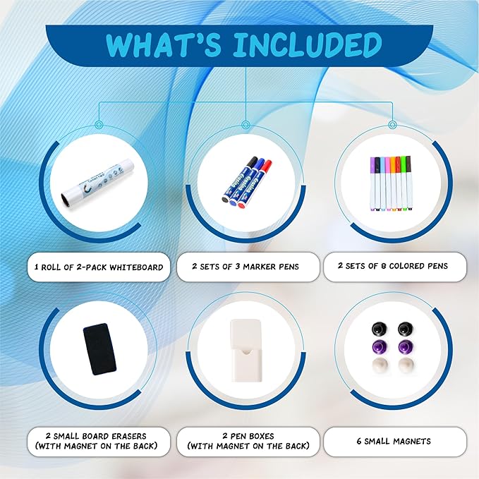 - 2-Pcs Dry Erase Board Sheets: Includes 6 Premium Markers, 2 Erasers, 2 Magnetic Storage Boxes, 6 Magnets, and 2 Sets of 8-Color Watercolor Pens. Unleash creativity and capture inspiration with this magnetic paper suitable for home, kitchen, office, classroom, studio, game room, and more!