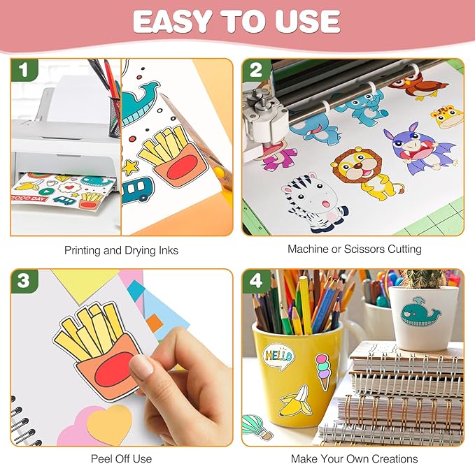 - Easy to Use: Compatible with most laser and inkjet printers, such as Brother, Canon, Epson, HP, etc. We just put it directly into the printer. In addition, it fit for processing knives and easy to engrave different sticker patterns.Unique backing layer makes peeling a breeze, while premium glue makes application easy and smooth.