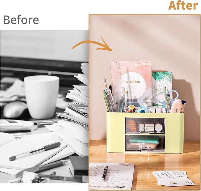 - 【Convenient And Multifuction】This Desk Caddy is no installation required not only perfect for storing your desktop stationery and many other desk widgets but also great for storing your makeup brushes, nail polishes, lipsticks, and other small personal items sorted by type. The transparent drawer makes it way easier to find what you need! and You can put any other daily necessities on the organizer, It helps you keep your stuff organized.