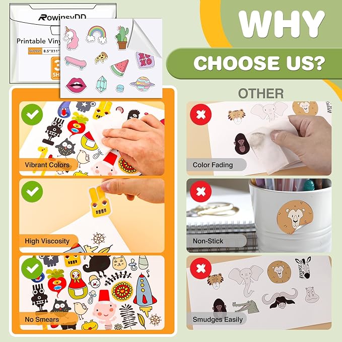 - Printable Vinyl Sticker Paper:We offer 30 sheets of 8.5x11 inch waterproof printable glossy sticker paper. you can create gorgeous waterproof labels for multi-purpose use both indoors & outdoors with the printable vinyl sheets.