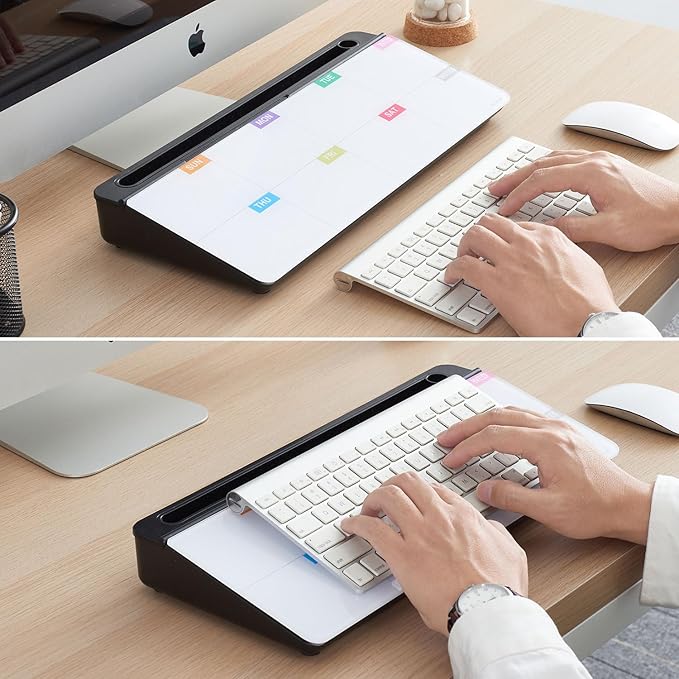 - PERFECT DESIGN: Quickly record your weekly schedule-Sunday through Monday. Maximize your work area. The desktop weekly calendar whiteboard is designed to sit perfectly between a keyboard and monitor and is slope angled for comfortable reading and writing, or typing when you are using it as a keyboard stand.