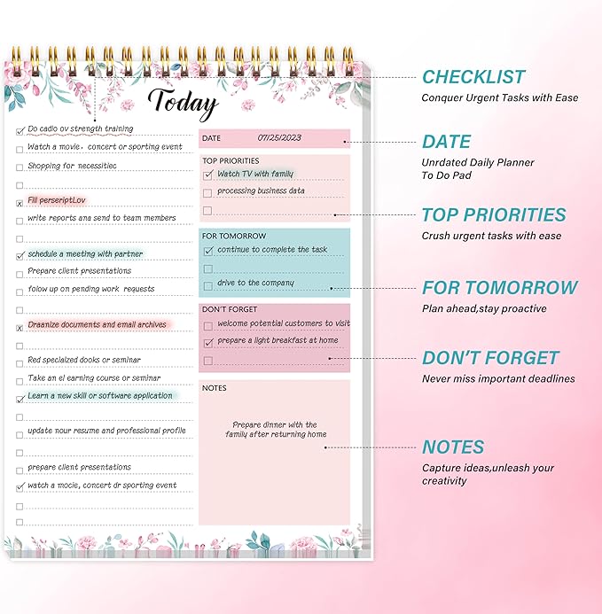 - [BOOST YOUR PRODUCTIVITY] - Our 6.5" x 9.8" daily to do list notepad page is divided into top priority, for tomorrow, don't forget, notes. Great to keep life more organized and manageable