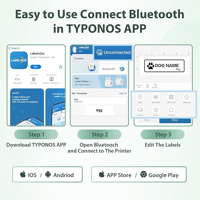 - 【Easy to Use】The bluetooth label maker is compatible with IOS and Android phones via wireless Bluetooth connection. Step 1: Download the "Labelnize" APP from Google Play or App Store.Step 2: Install the paper roll. Step 3: Connect P21 Bluetooth in APP. Step 4: Select Quick Template and start printing. (Note: Not applicable to computers)