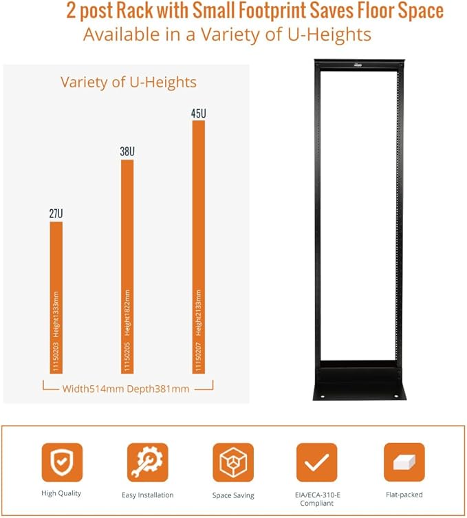 - 【Durable】: 2-Post Network Rack made from 2.5mm heavy duty Cold Rolled Steel; 1763lbs(800kg) weight capacity; Electrostatic powder coat preventing rust and corrosion