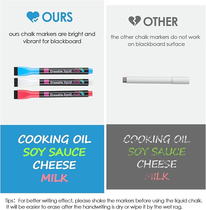 - Cost-effective Sets: Package include: 3*liquid chalk markers, 1*rag and 1*12''x 8'' black dry erase board. Ideal complete set for home, office, or classroom. The colors of the chalk markers are super bright and look great up against the black magnet board sheet, which is easier to read, please follow the instruction for chalk markers before use.