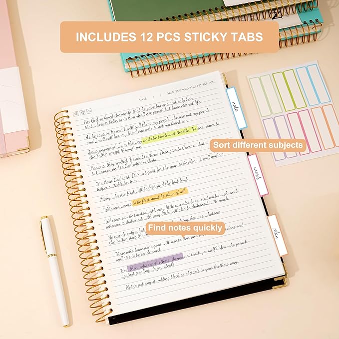 - Upgraded Lined Journal Notebook: Note book comes with 12 pcs colored tab stickers. You can create sections to organize multi subject and quickly locate desired parts. With an elastic closure band, keep the covers closed and secure when not in use, also great for keeping your place as bookmark. The back cover includes a pocket for cards and note-taking notes.