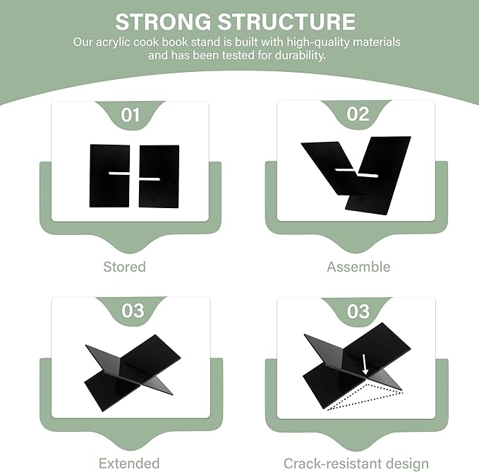 - [Strong Structure]. This bookstand is made of durable, heavy duty, 8mm acrylic material sure to withstand typical everyday wear and tear. This X-shaped bookholder is sturdy and supports a variety of heavy-weight books. Our product is a perfect book holder for desk and can be a great addition to your kitchen as a recipe holder. Imagine how great this quran holder would look on your counter!