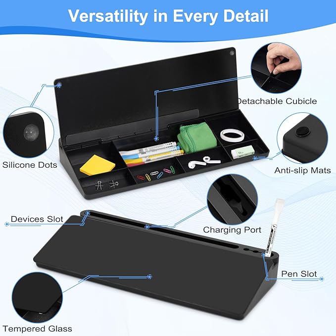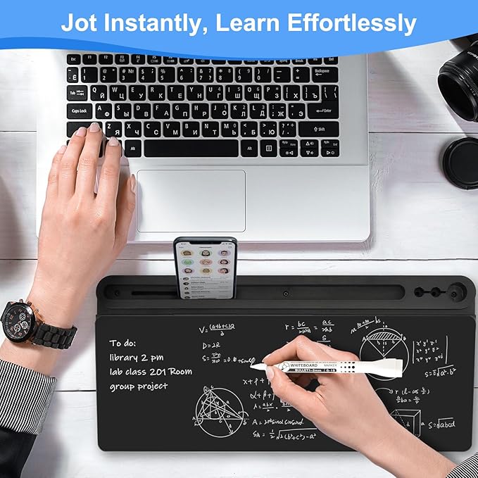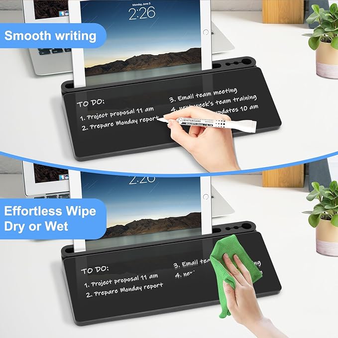 - Multiple Functions - To enhance the overall convenience of the product, this whiteboard includes 1 large pen holder, 2 small pen holders and 1 slot on the top which can hold 3 markers, a tablet and a phone. Equipped with charging port notch in the slot, the desk board is a good option to realize office charging, and you can charge your phone quickly. This dry erase board is more ergonomic with the perfect ramp design and non-slip design, which can make itself be used as keyboard pad.