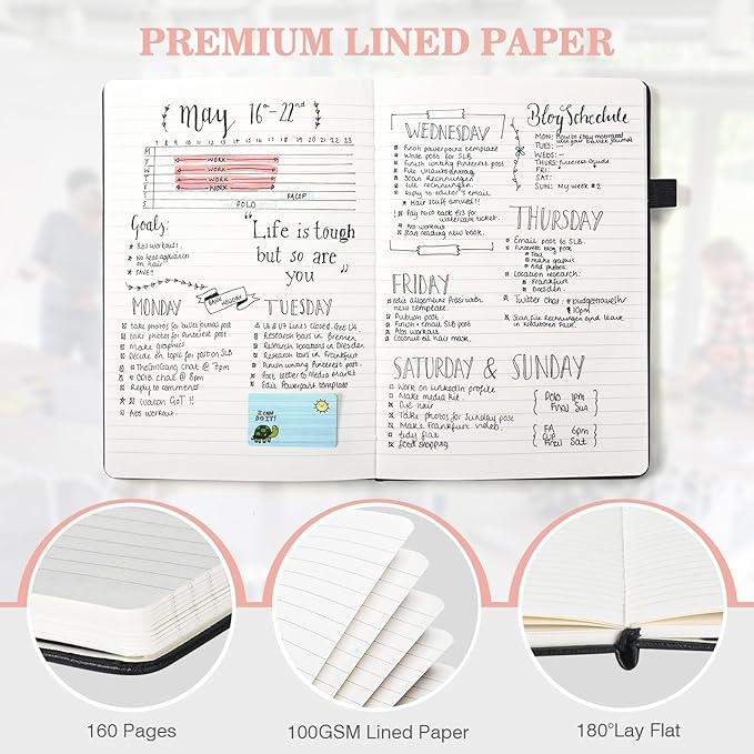 - 【Premium Writing Experience】These lined journals boast 100GSM paper with 80 sheets (160 pages). The paper is compatible with a wide range of pens, ensuring a seamless writing performance without any ink bleed-through. The 7mm line spacing is suitable for most people's writing preferences. Additionally, the pages can lay flat at 180°, allowing for easy note-taking. Ideal for school, office, outdoor activities, and travel.