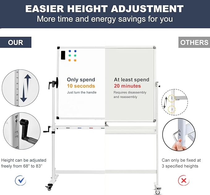 - EASIER TO ADJUST - Simply turn the handle to adjust the height or writing angle, which takes only 1 minute. Other standing whiteboards require disassembly and reassembly to adjust the height, which will waste a lot of your time and energy.