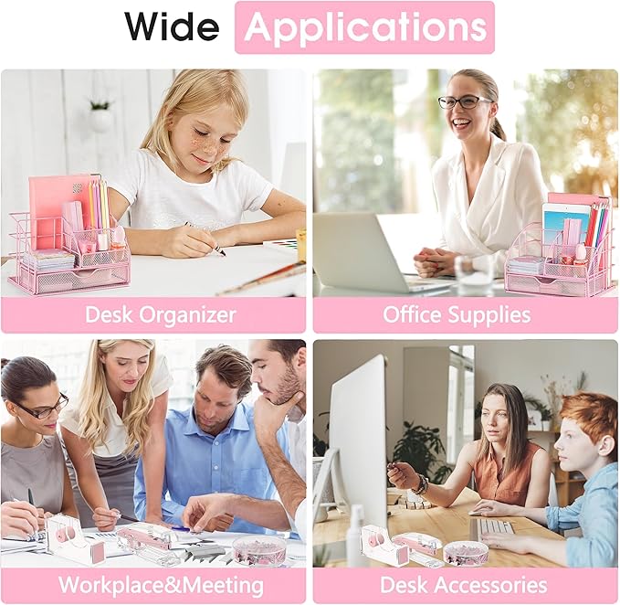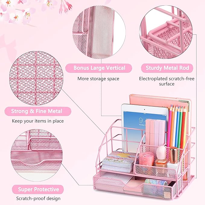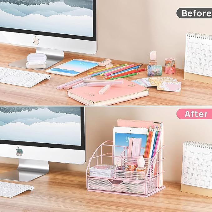 - Multifunctional Desk Organizers: With 5 separate compartments and 1 sliding drawer. Easily sort and organize pens, notes, calendars, and other office supplies, and can be used as a cosmetic organizer or stationery organizer. Office organizers for desk adopt a powder coat finish and electroplating technology, wear-resistant, anti-oxidation, and long-lasting, with the rounded corners metal rim to protect your desk.