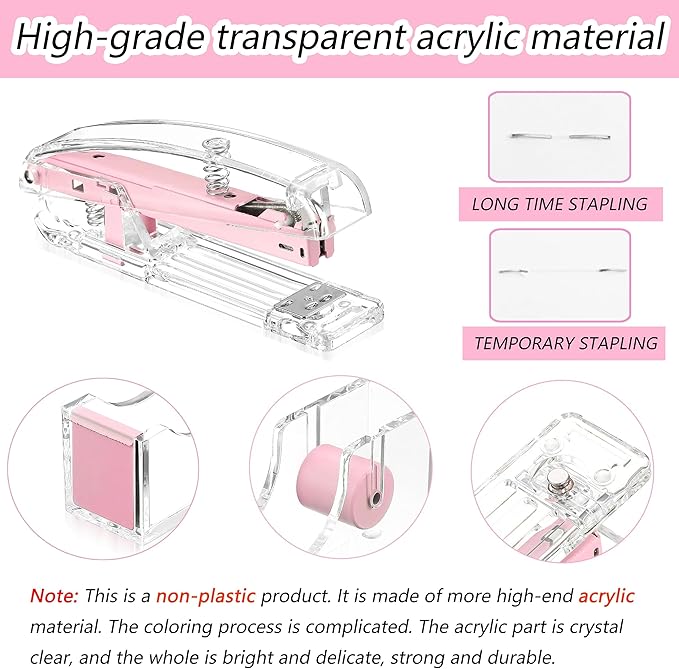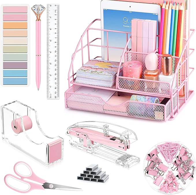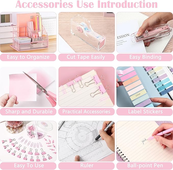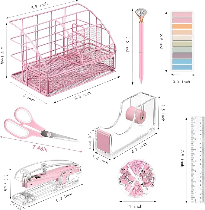 - Package&Size: 9pc pink office supplies set; a desk organizer:8.6"x5.9"x5.9", a tape dispenser:4.7"x1.3"x2.5", a stapler:6.2"x1.3"x2.5", a ballpoint pen:5.6", a scissor:6.2"x2.4", a 4-grid clip set:3.9"(including 30 paper clips:1.1"x0.3", 7 large binder clips:1.3"x0.7", 13 small binder binders:1"x0.6", 20 thumbtacks:1"), a ruler:7.8"x1.1", 200pcs sticky tabs and 1000pcs staples. A GREAT IDEA for Christmas gifts, Thanksgiving gifts, party gifts, birthday gifts, back to school gifts.