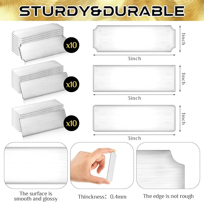 - What You Will Receive: you will receive 30 pcs of custom name tags, which can meet your daily life needs, they are not suitable for mechanical engraving, only for laser engraving; Please pay attention to the model and power of the machine; Too much power will damage the label, too little power will not be able to engrave the words; You need to pay attention to whether your machine is suitable for laser engraving of ordinary metals; Some machines may not be able to engrave all types of metals