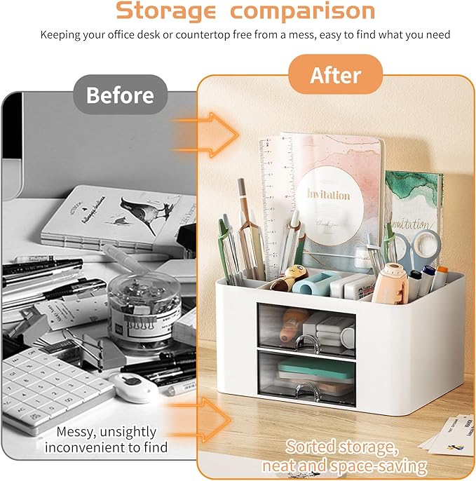 - 【Versatile Design】This Desktop Storage Box has 2 drawers and 5 large capacity divided compartments, no assembly required. It has enough storage space to accommodate all of your school supplies. Keep things at hand while not disturbing, improving work efficiency
