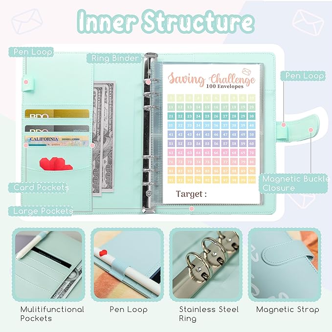 - 【Multifunctional Budget Organiser】 Beyond just cash, this binder offers sleeves for small inserts, accommodating cards, pens, bills, receipts, and notes. Whether your goal is $5,000, $5,050, or even a modest $50, this binder is designed to meet all your savings milestones.
