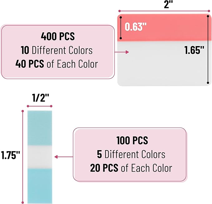 - Package includes 500 pieces of sticky tabs in 21 sets, 400 pieces of 2-inch tabs in 20 sets with 10 different colors, and 100 pieces of 0.5-inch tabs in 1 set with 20 pieces of each color.