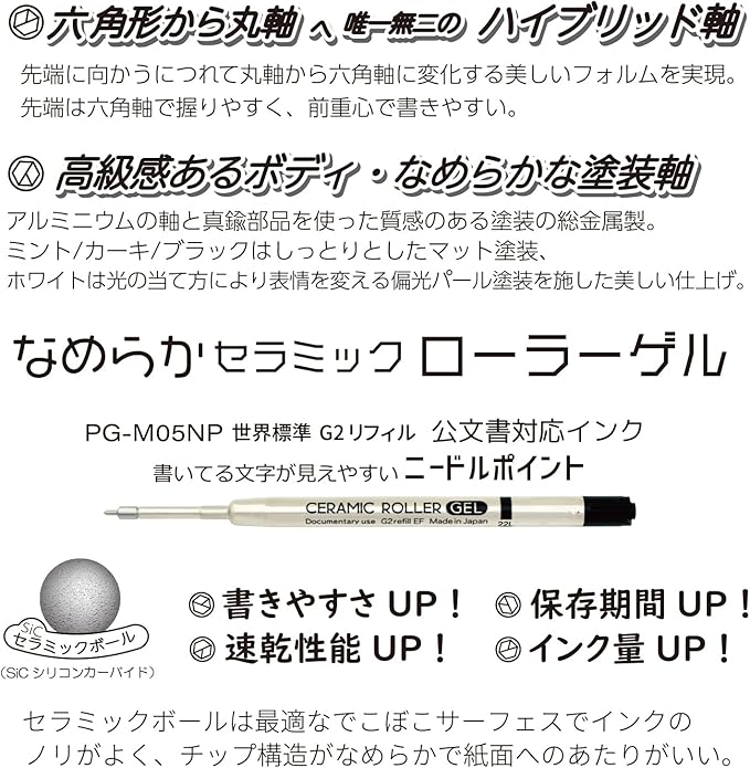 - Experience the newly developed liquid gel ink (in black) that not only enhances writing comfort but also delivers quick-drying performance. The needle tip ensures clear visibility of the paper surface while writing.