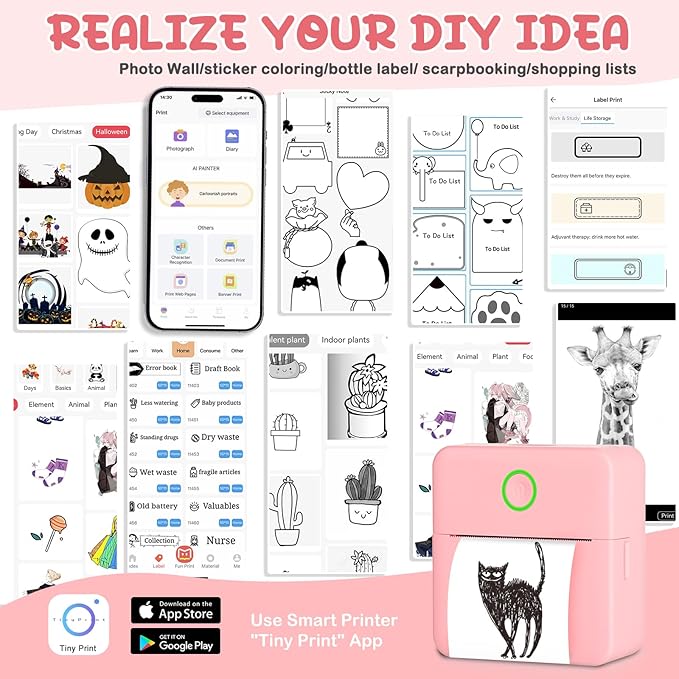 - 🎁【Portability and Reliability】 Inkless pocket printer size is 3.4L*3.3W*1.6H inch, compact and only 160g. The inkless printer also came with with low power consumption, built-in 1200mAH lithium battery, fully charged can be used for 15-20 hours. This thermal pocket printer for your DIY idea, the information and image on the phone screen can be printed instantly, convenient to print anytime anywhere. Helps you quickly organize and summarize work plans, shopping lists, etc, improve efficiency.