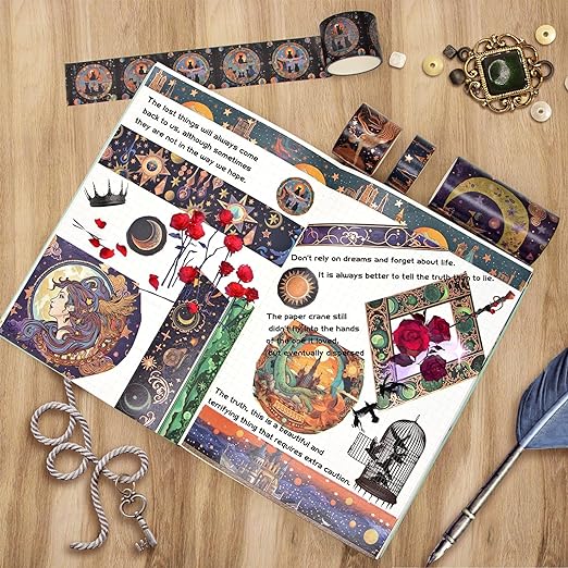 - Magic Theme Design -29 rolls of magic theme washi masking tape sets. Each roll of washi tape contains different magic elements, including stars, crescents moon, witches, castles, gems, galaxy, dragons and other magic elements. The washy-tape has rich colors and diverse patterns, breaking your traditional impression of washi tape.