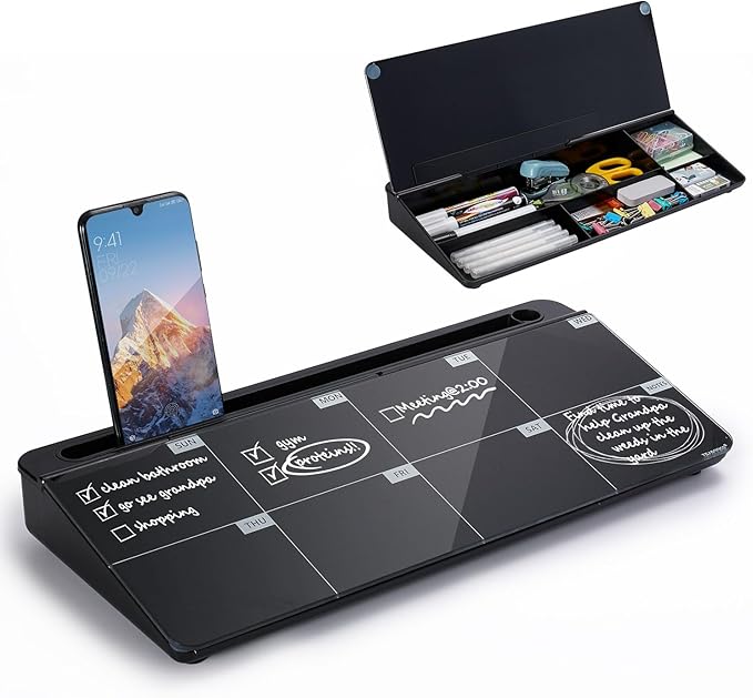 - HIDDEN STORAGE & PAD/MOBILE TRAY: De-clutter your desk by storing markers, magnetic eraser and other desktop accessories in the opening drawer or place markers on the accessory tray for quick access. And one more long tray on the top of the dry erase white board for your pad or mobile.