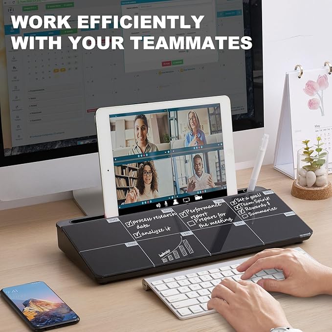 - PERFECT DESIGN: Maximize your work area. The desktop whiteboard is designed to sit perfectly between a keyboard and monitor and is slope angled for comfortable reading and writing, or typing when you are using it as a keyboard stand.