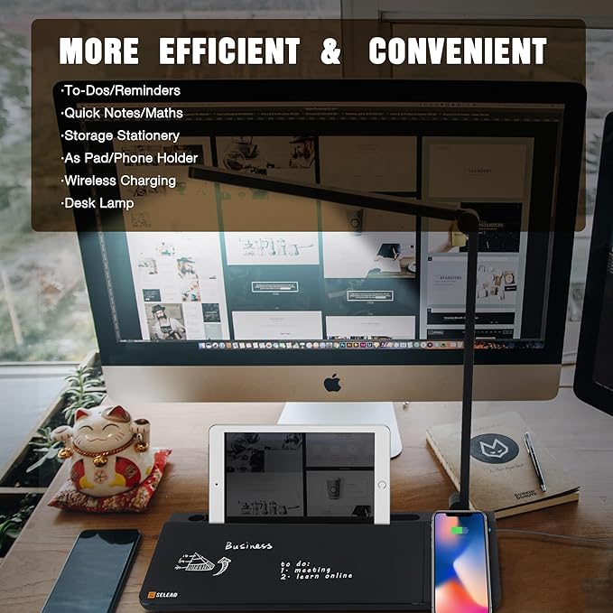 - β MULTIFUNCTIONAL: Storage, wireless charging, lighting, write, mirror, hold iPad/iPhone, keyboard stand, our desktop white board is an all in one multipurpose board. Equipped with 1 adapter, 2 black dry erase markers, 1eraser and 5ft USB Type C cable, instructions.