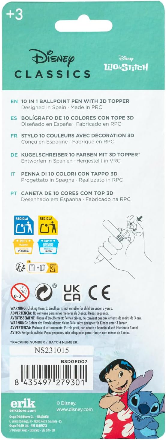 - π©΅ Specs - This multicoloured pen is made of PVC and has 10 colours with a fun 3D topper with Stitch figure. Ball point pen contains 10 colours in 1 single pen: purple, blue, light blue, red, yellow, orange, green, pink, brown and black ink.