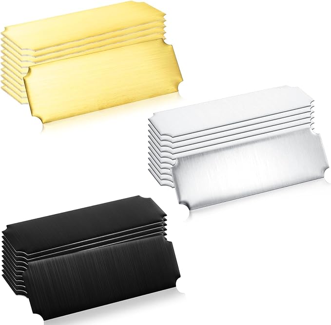 Therwen 30 Pcs Name Plates Laser Engraved Brushed Stainless Steel Plate Personalized Plaque Blank Custom Name Tag Frame Label with Adhesive Backing(Gold, Silver and Black Notched Corner,1''x 3'')
