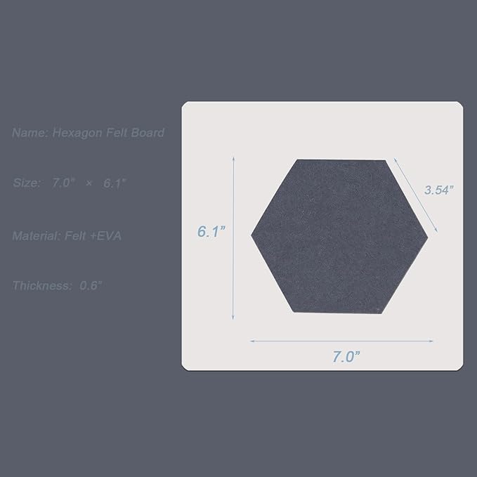 - 1. Size and Material - The size of the bulletin board is 7.0 × 6.1 inches. Each hexagon board is 0.6 inches thick, The pin won’t poke through the board. The surface of the felt board is covered with felt and the back is made of EVA, sturdy and lightweight.