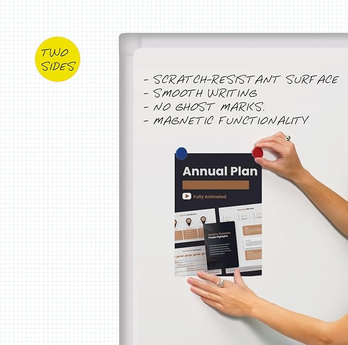 - [Quick Reversible Feature] With dimensions of 48x32 inches, this board doubles your writing space with just a press of the central button to flip it from one side to the other. It offers plenty of space for writing, and you can keep charts or resources on the back, switching back and forth with ease. You can even use both sides simultaneously for different tasks.