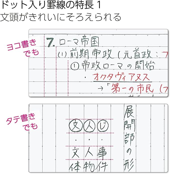 - Functional Dotted Line: Regular 7mm line spacing suitable for most work or study scenarios. There is 30 lines for each page, and the dots on the line are perfect for precise note-taking, detailed math or chemistry chart diagrams, artistic sketches, and student use. The 7mm line sapcing of Kokuyo subject notebook is only 0.1mm less than college ruled, the difference is small enough to be ignored