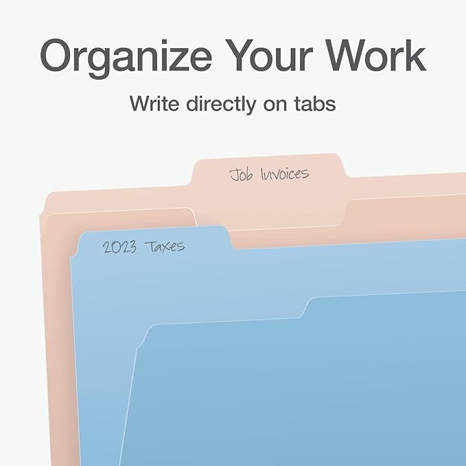- Letter size folders fit neatly inside hanging file folders and have roomy 1/3-cut tabs in assorted positions, so it's easy to label folders and sort files by category, date, or priority