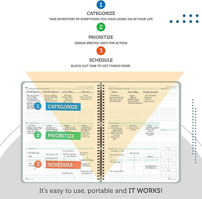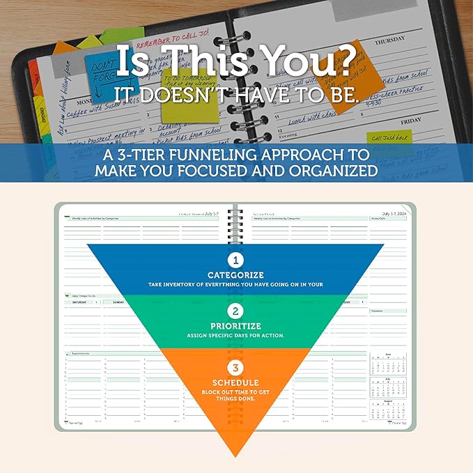 - EXCLUSIVE 3-TIER FUNNEL DOWN approach helps you prioritize and organize all that matters. Section 1- CATEGORIZE is to inventory everything you have going on. Section 2 - PRIORITIZE items from section 1 to specific days for attention. Section 3 - SCHEDULE is to block out time for tasks from section 2