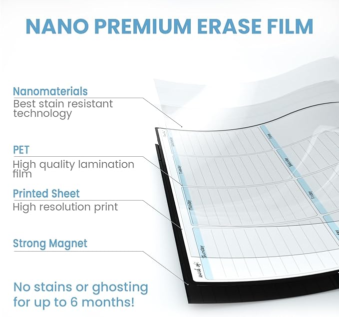 - NEW TECHNOLOGY, NEW EXPERIENCE - We use nano premium erase film on our products. Compared to the old PET film, the nano material will make your writings super easy to be wiped off even after you leave the writings on the planner for a very long time.
