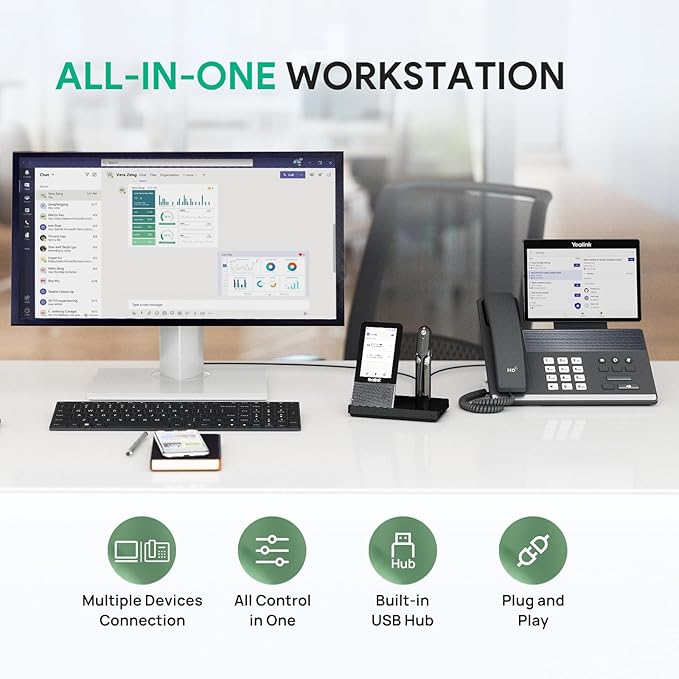 - Broad Compatibility: The Headset Base connect to PC, desk VoIP phones via included USB cable, and smartphones via Bluetooth. transfer both work calls and personal calls to the wireless headset workstation.Compatible with Yealink Desk Phones: USB Phone: T4XS/T4XU/T53/T5XW/T58A/VP59; Skype for Business Phone: T48S/T56A/T55A/T58A; Teams Phone: MP54/MP56/MP58.Poly desk phones VVX 411, VVX 401/501, VVX 250/350/450; SNOM desk phones D765 D385 D735.