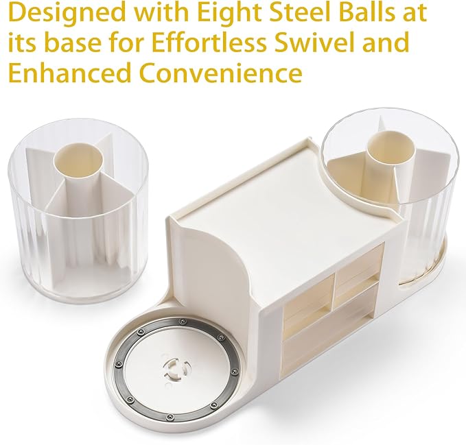 - 【Multi-purpose Rotating Desk Organizer】Ideal desk storage for desk accessories. Good desk organizer with drawers for small desktop stationery supplies, sticky notepads. Great for scissors, tape, stapler, flash drives, erasers, rubber bands, white-out, rulers, pens, pencils, paper clips, thumbtacks, highlighters, markers, glue. Holds arts and craft supplies, paintbrushes, household tools. Storage for reading glasses, cosmetics, makeup, jewelry, lipstick, cell phone, keys, business card.